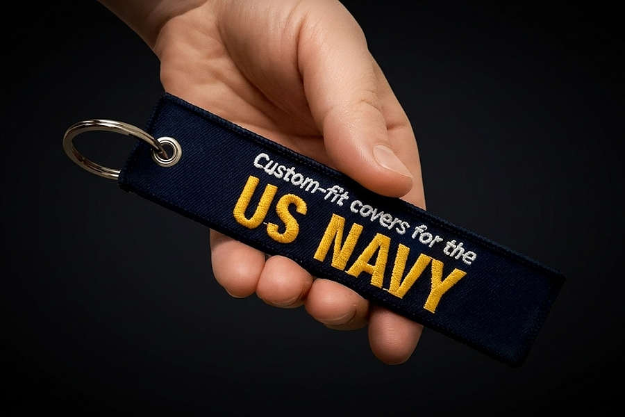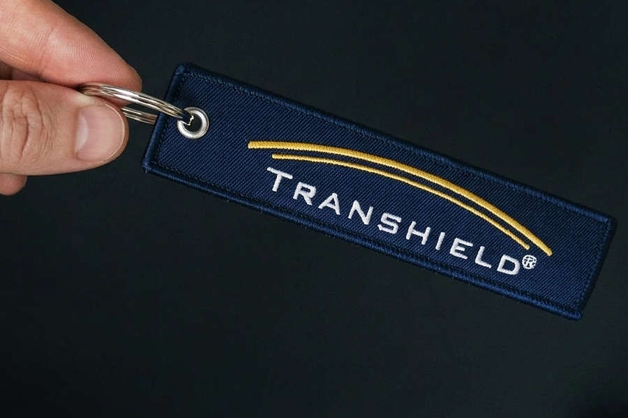 Embroidered Jet Tags give you a raised, textured look. Thread is stitched on top of the fabric base, creating a 3D effect that stands out on the key ring. Popular with military units, fan merchandise, and premium branded gear.