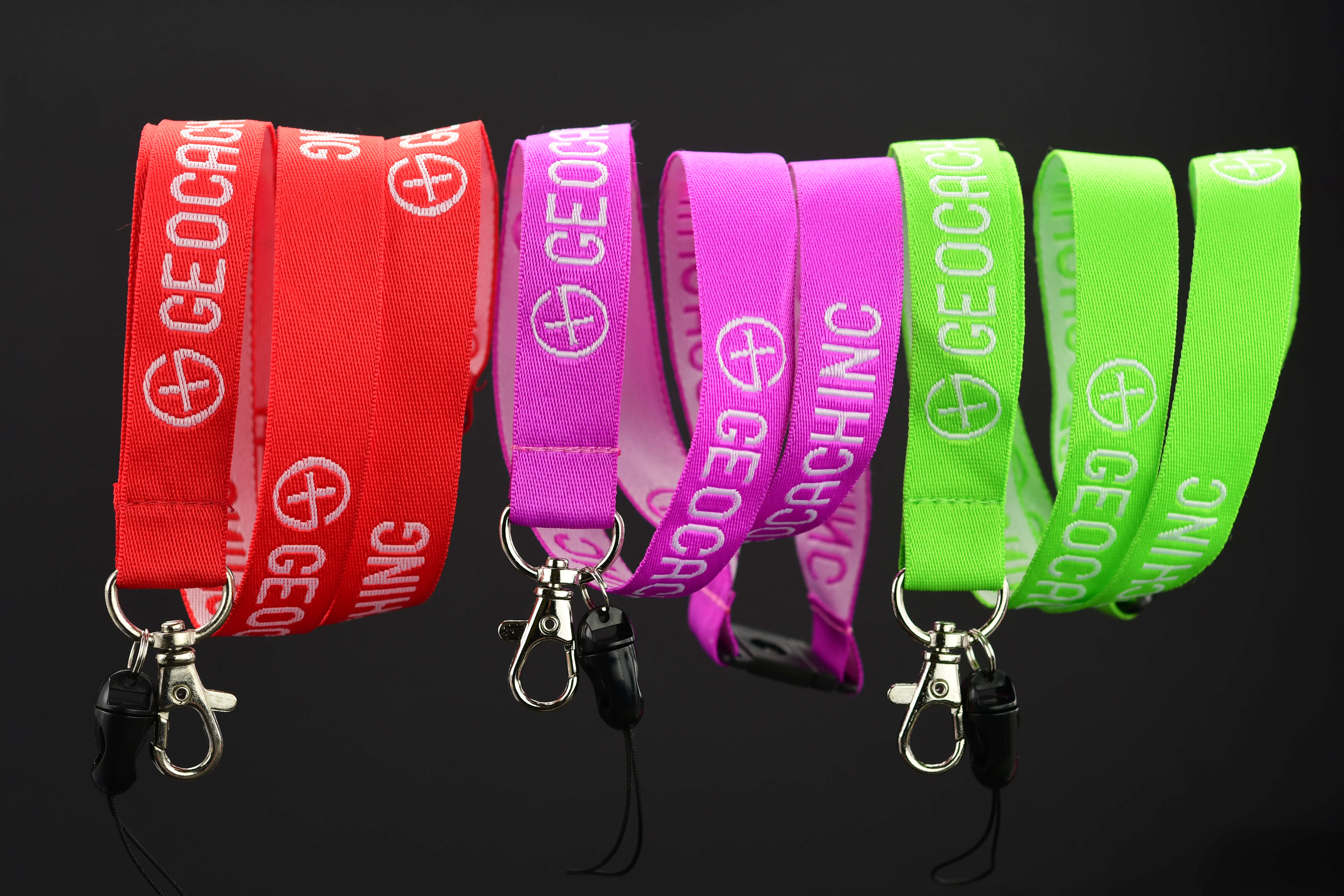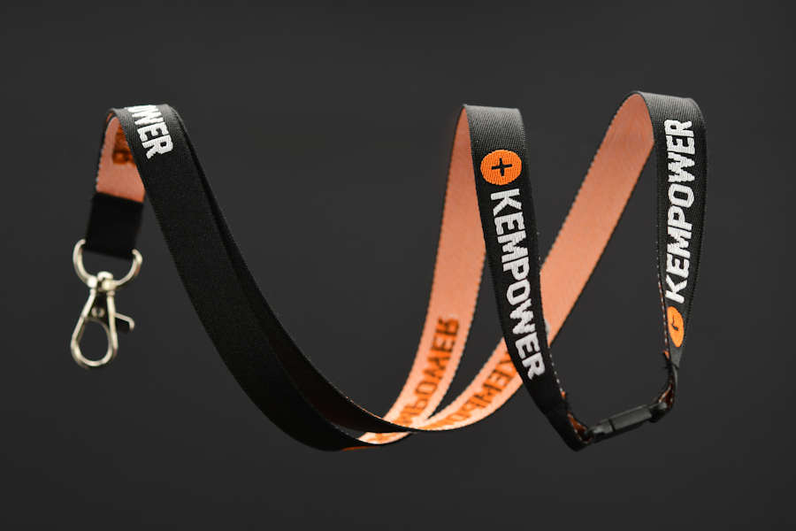 The lanyard is woven flat to the desired width using colored threads. The lanyard always has at least 2 different yarn colors to form the desired base color and a logo in its basic form. On the back of the lanyard, the design is reversed in contrasting colors.